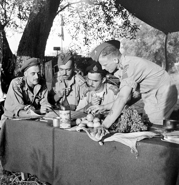 Unidentified officers of the Royal 22e Régiment reviewing plans during the advance on Busso, Italy, October 1943. (MIKAN 3521116)
