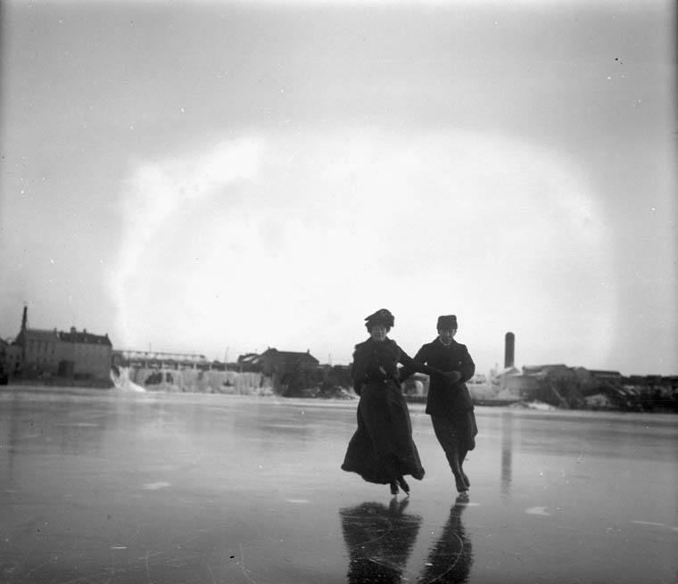 The Governor General Lord Minto and Lady Minto skating on the Ottawa River. Lord Minto donated the Minto Cup in 1901. This photograph was taken by William James Topley. (MIKAN 3436516)