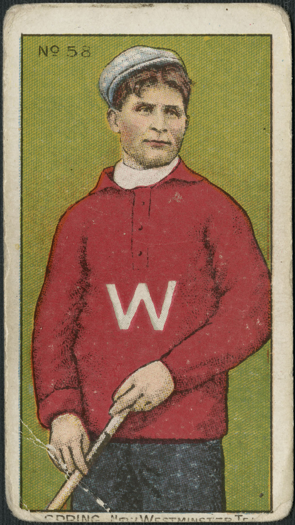 Edouard L’Heureux, goaltender, Nationale team (Montreal Nationals). His team lost to the Salmonbellies in the Minto Cup challenge series, September 1910. Professional lacrosse was a popular sport in Canada before the First World War. The trading cards featured here were sold by Imperial Tobacco in Canadian cigarette packets, c. 1910-1911 (MIKAN 2962986)