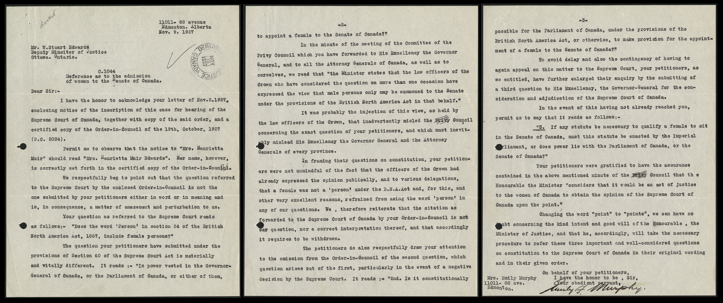 Letter from Emily F. Murphy as to the admission of women to the Senate of Canada, addressed to Mr. W. Stuart Edwards, Deputy of Minister of Justice, November 9, 1927. (MIKAN 3812093)