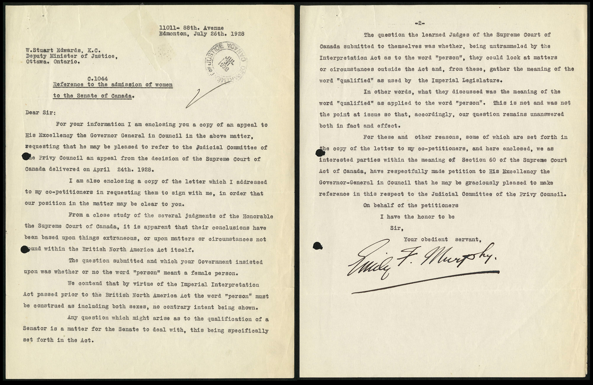 The events leading to the Persons Case began in 1916 when Emily F. Murphy was appointed as the first female police magistrate in the British Empire. Undermining her authority, lawyers challenged her position as illegal on the grounds that a woman was not considered to be a person under the BNA Act, and therefore she was unable to act as magistrate. Although the Provincial Court of Alberta would confirm Murphy’s appointment by declaring women as “persons,” this decision was not proclaimed federally.