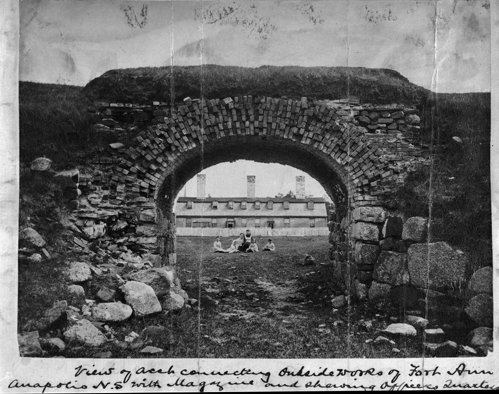 View of arch connecting outside works of Fort Anne, Annapolis, N.S. with magazine and showing Officers’ Quarters in the distance (MIKAN 3305260)