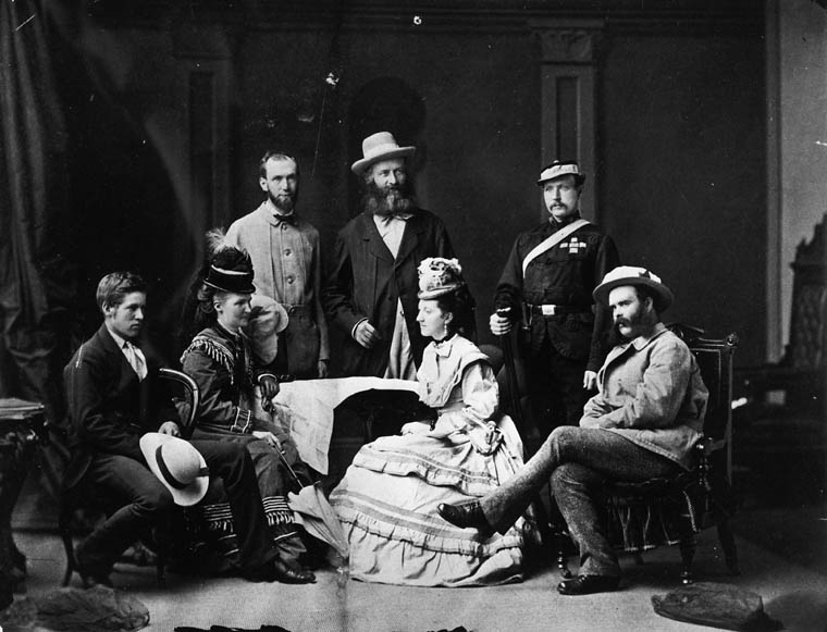 Members of the Sir Sandford Fleming party for the “ocean to ocean” expedition through Canada in 1872. (Sitting L to R:) Frank Fleming, Mrs. Fleming, Mrs. Moren, Dr. Arthur Moren. (Standing L to R:) Rev. G.M. Grant, Sir Sandford Fleming, Col. Robertson Ross (MIKAN 3195228)