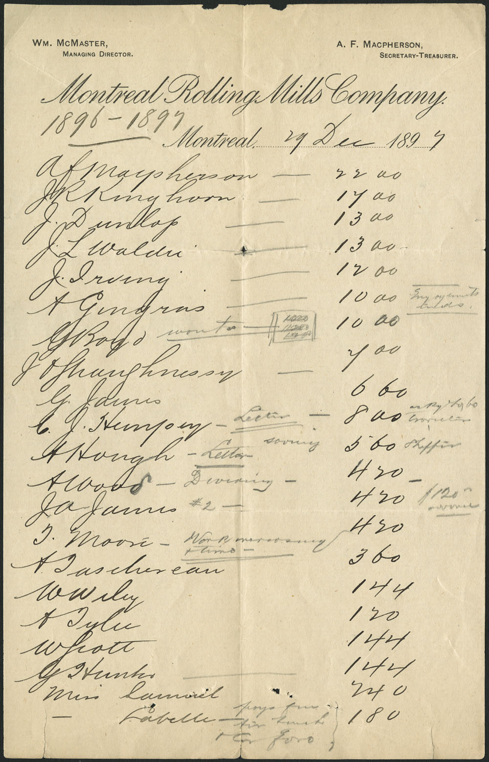 List of salaries for some managers and workers at the Montreal Rolling Mills Co., December 29, 1897, vol. 107, file 11 (MIKAN 4932160)
