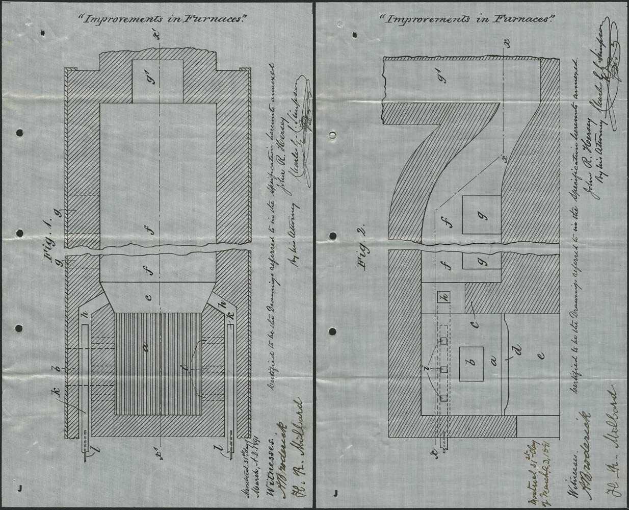 Drawings included in a patent entitled “Improvements in Furnaces,” drawn and signed by John Randolph Hersey, March 1891, vol. 118, file 7 (MIKAN 4932167)