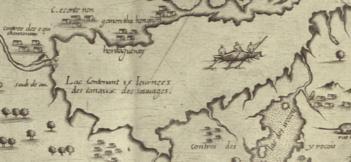 Amerindians paddling their canoes (details of the 1612 map; MIKAN 3919638)