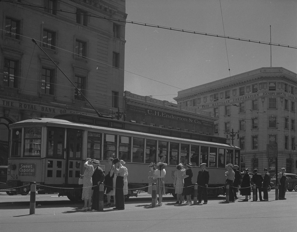 Group of people waiting to enter a streetcar, Winnipeg, Manitoba (MIKAN 4328408)