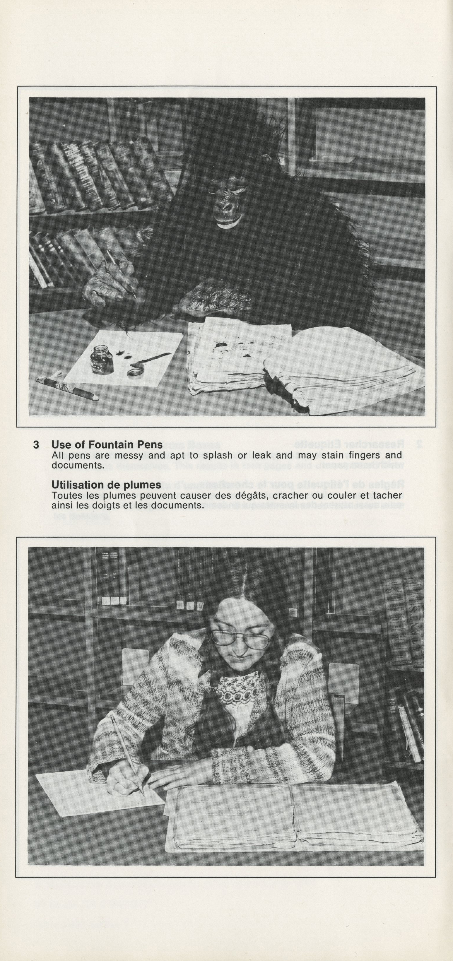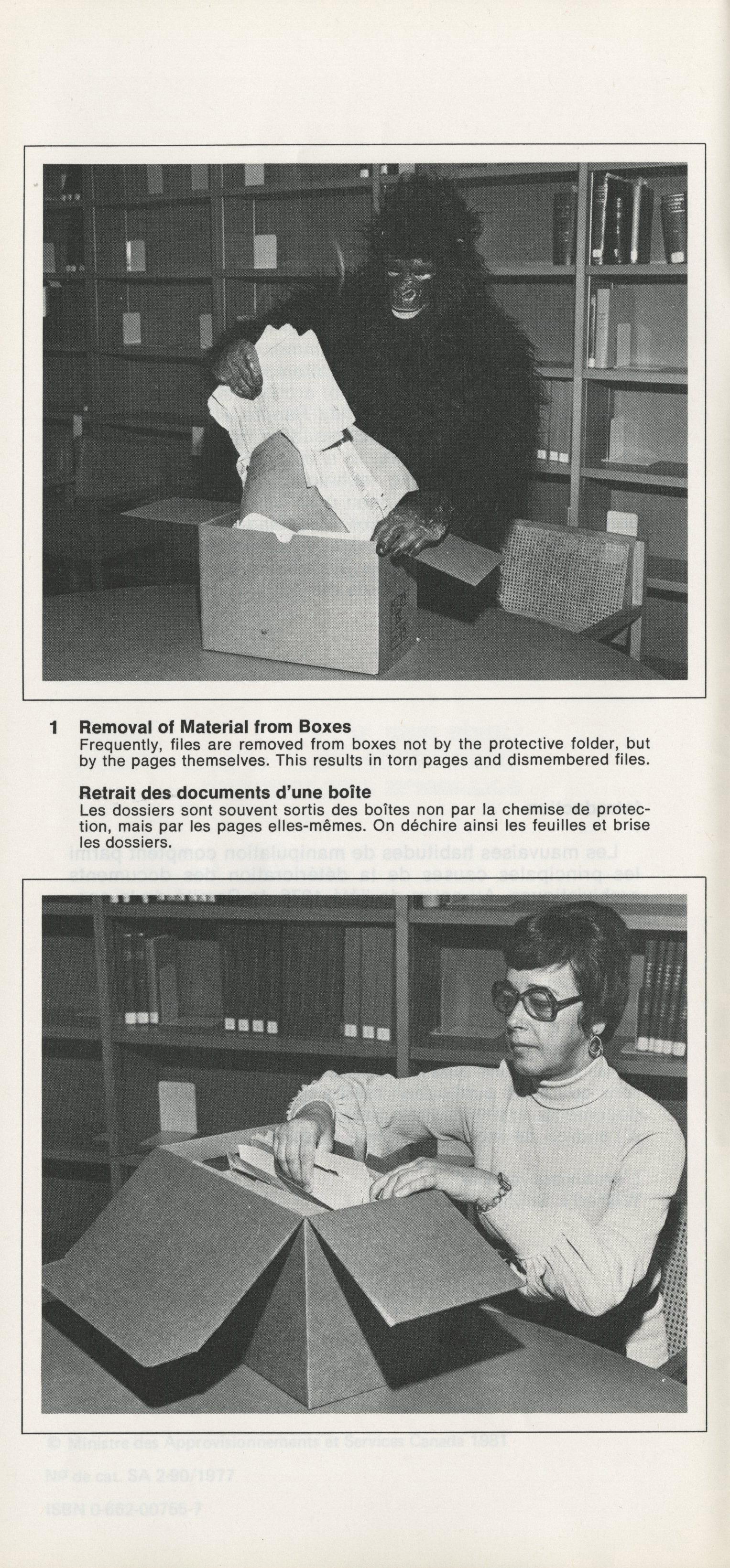 “Improper handling is a major factor in the deterioration of archival documents. During the summer of 1976, the Archives Branch Conservation Committee attempted to illustrate techniques for the correct handling of archival materials through a photographic exhibition entitled HANDLE WITH CARE – FRAGILE – AVEC SOIN. The booklet resulting from that exhibition is intended to demonstrate, in a manner both pointed and humorous, these handling techniques. Only the most common archival media has been used as examples; similarly, only the most obvious causes of damage have been illustrated. We hope that this booklet will promote an appreciation of the fact that everyone who handles archival materials shares a responsibility towards our heritage.”