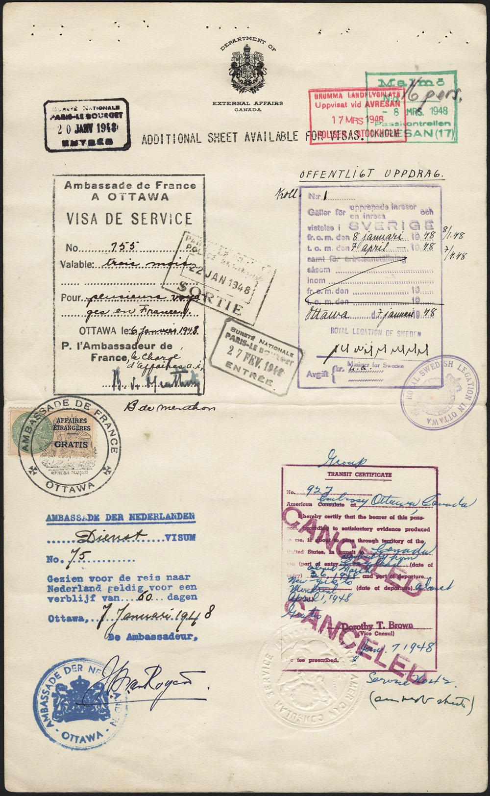 This collective passport includes the photographs of, and information about, 19 men from the Royal Canadian Air Force Flyers who were on Canada’s 1948 Olympic Hockey Team. They departed on January 8, 1948, for the United States of America, Belgium, Czechoslovakia, France, the Netherlands, Sweden, Switzerland and the United Kingdom, and returned to Canada as gold medalists on April 8, 1948.