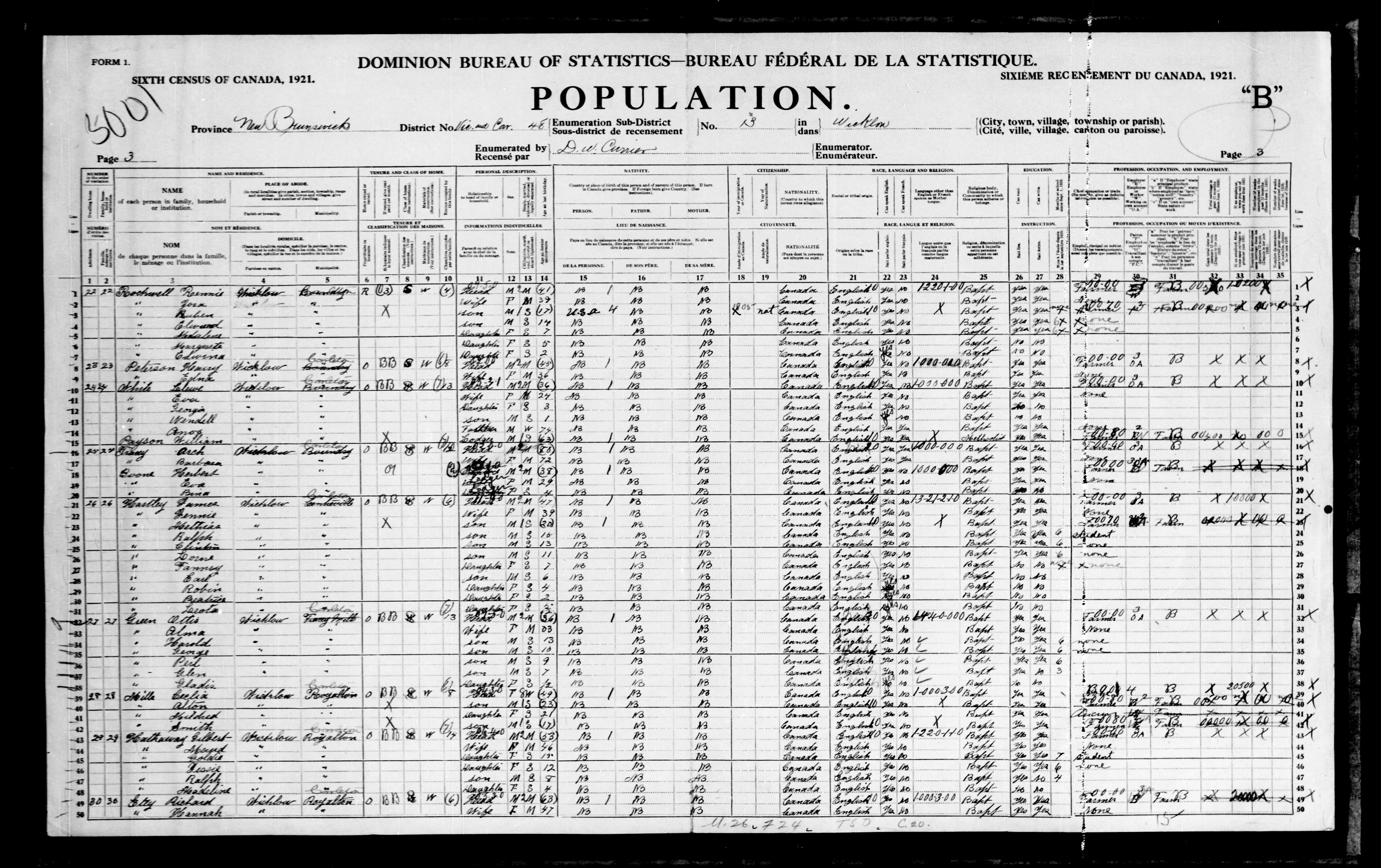 The second issue, the identification of those enumerated as living in the village of Royalton, should have been straightforward, but it quickly became evident that this also was going to be complicated. I went to the printed Volume I – Population of the Sixth Census of Canada, 1921, and found Table 8 – Population by Districts and Sub-districts. Under Victoria and Carleton, then Carleton County, I found Wicklow – population 1,689. However, there was no entry for Royalton under the heading Towns, nor was there a breakdown by sex. However, Table 16 – Population…classified by sex gave me the breakdown for Wicklow – 900 males and 789 females. This was definitely getting closer, but remember, Wicklow Parish has three sub-districts, of which no. 13 includes Royalton. I needed to get as close to the census numbers for the village as possible.