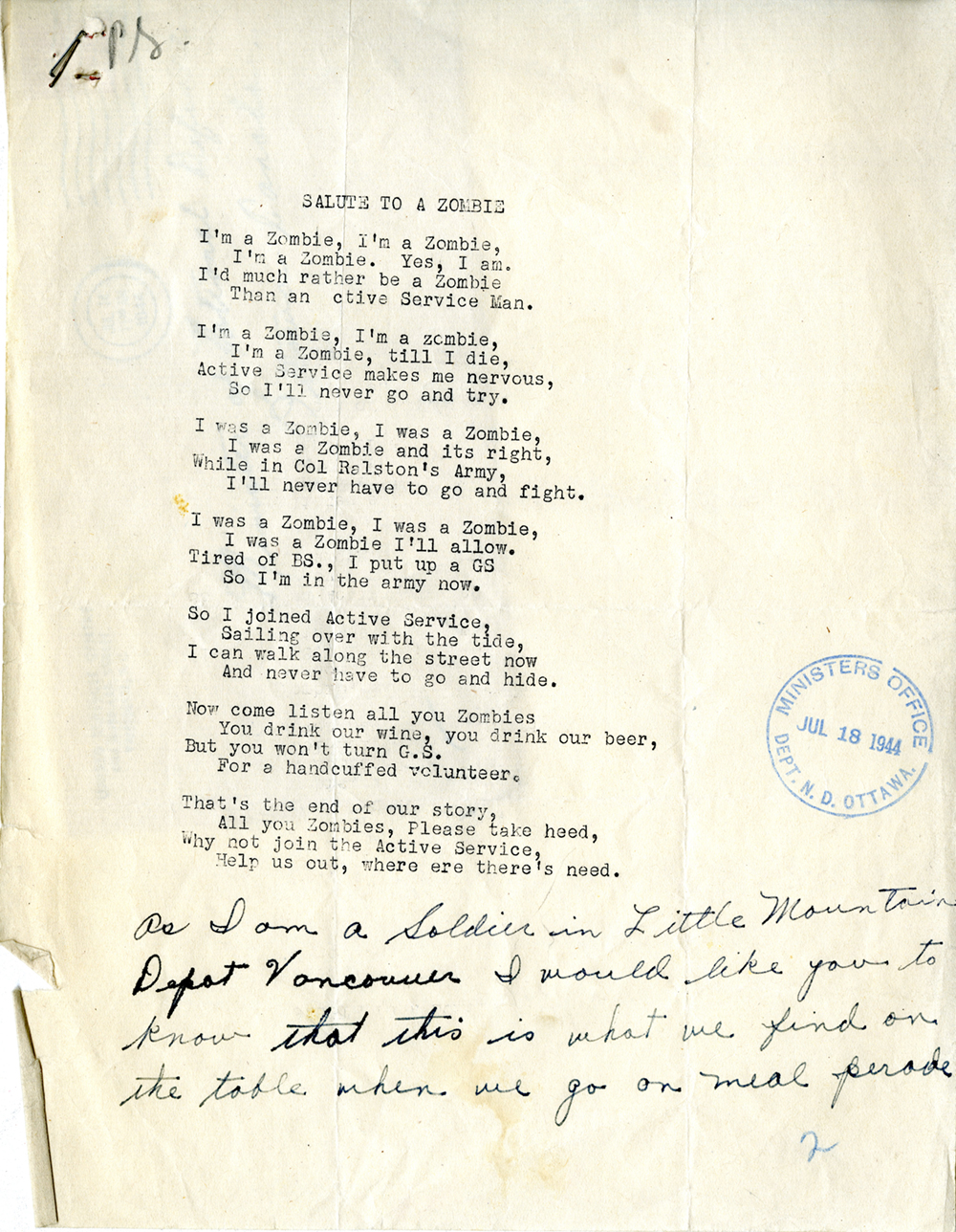 The idea of zombies was seared into the Canadian imagination in July 1943 by reports about a riot at a Calgary military base. Fighting broke out there after GS men taunted those who refused to serve overseas with “Salute to a Zombie,” a song that appears to have been commonly heard across Canada. The copy sent to Colonel J.L. Ralston, the Minister of National Defence, who strongly advocated sending zombies overseas, is preserved at Library and Archives Canada.