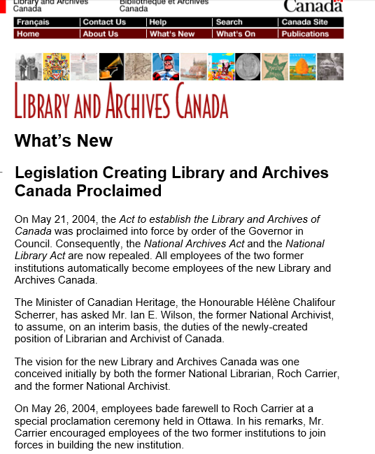 The proclamation of An Act to establish the Library and Archives of Canada is announced on LAC’s website