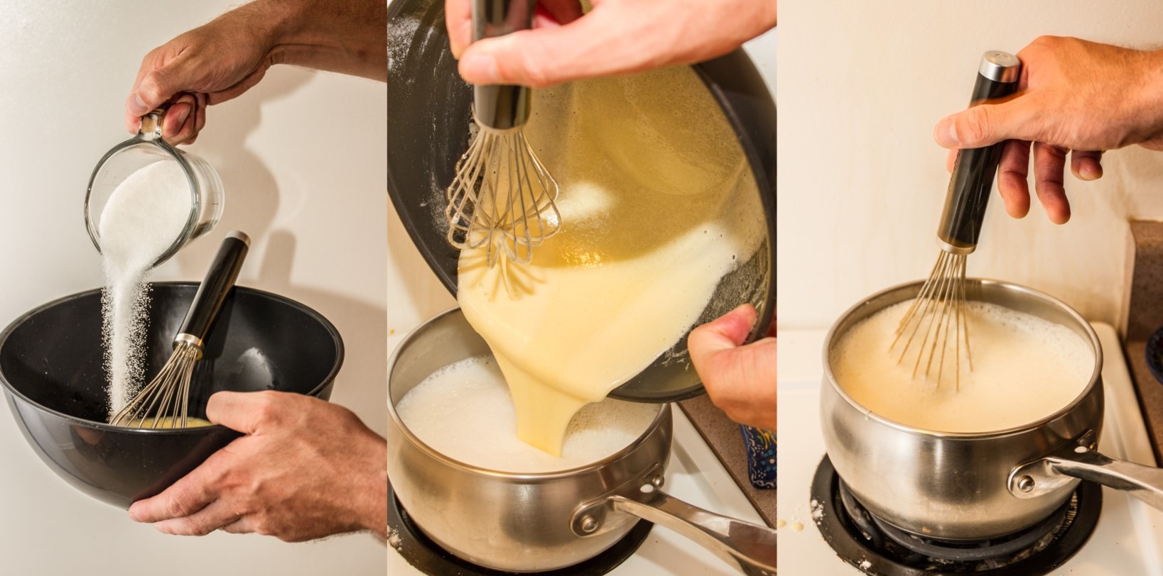 The only piece of advice that I would add, based on my previous experience, is to be careful once you combine the egg, flour and sugar mixture with the milk. It is best to temper the mixture by adding a little of the boiling milk, whisking vigorously as you do so. This elevates the temperature of the mixture and allows for a smoother transition to the whole of the boiling milk as opposed to simply shocking it. Once the mixture is added to the boiling milk, it is important to whisk it constantly until it thickens; otherwise, you will wind up with sweetened scrambled eggs!
