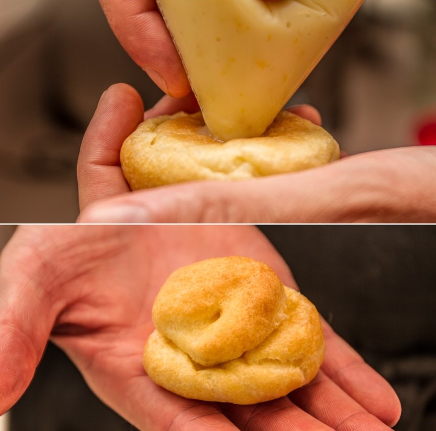 Piping the cream puffs and getting them ready for the oven. Courtesy of the author, Ariane Gauthier.