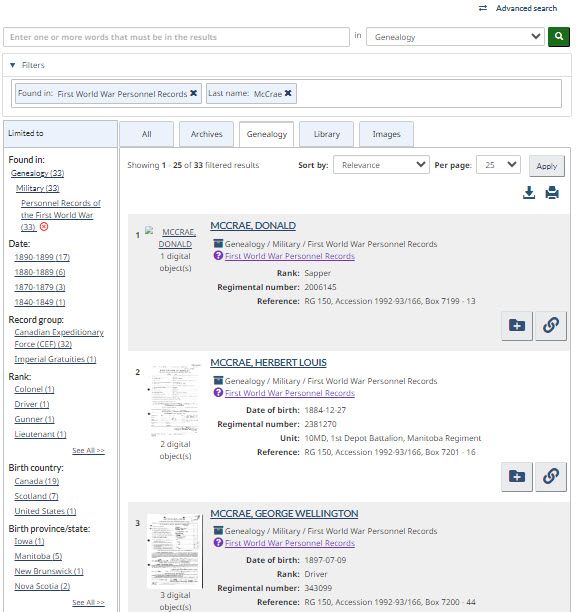 New features include the ability to search by date range, to save records of interest to your My Research using your LAC My Account and to apply filters during your search to help organize and limit the number of record results listed. It is important to note that both databases will provide you with the same number of search results based on similar search criteria. For example, searching the last name McCrae in either database will produce 33 different search results that you may select from. However, in the newer Personnel Records database, you can reduce the number of results using a variety of limiter options located on the search results page. These limiters include information such as military rank, date range for year of birth, birth country or different enlistment geographic options.