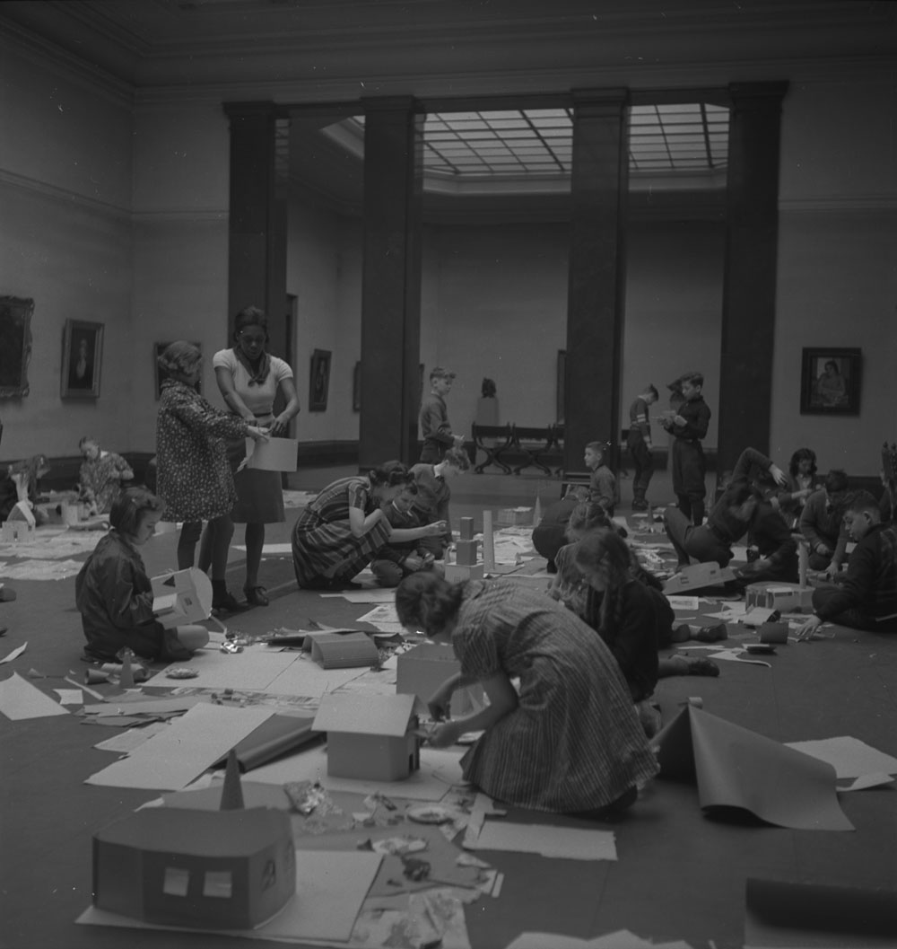 With roughly 300 students attending the classes each week, the gallery was a lively place on Saturday mornings. Children were allowed to work freely and encouraged to explore their ideas and creative impulses. Children took part not only in painting and drawing, but also in clay sculpting, creating costumes, and acting in pageants. The classes were held within the galleries themselves, with children spreading out across the floor to work in various media, always in the presence of great works of art hung on the gallery’s walls. Throughout the 1930s and 1940s, exhibitions of work from children in the Saturday morning classes were a regular feature on the gallery’s calendar.
