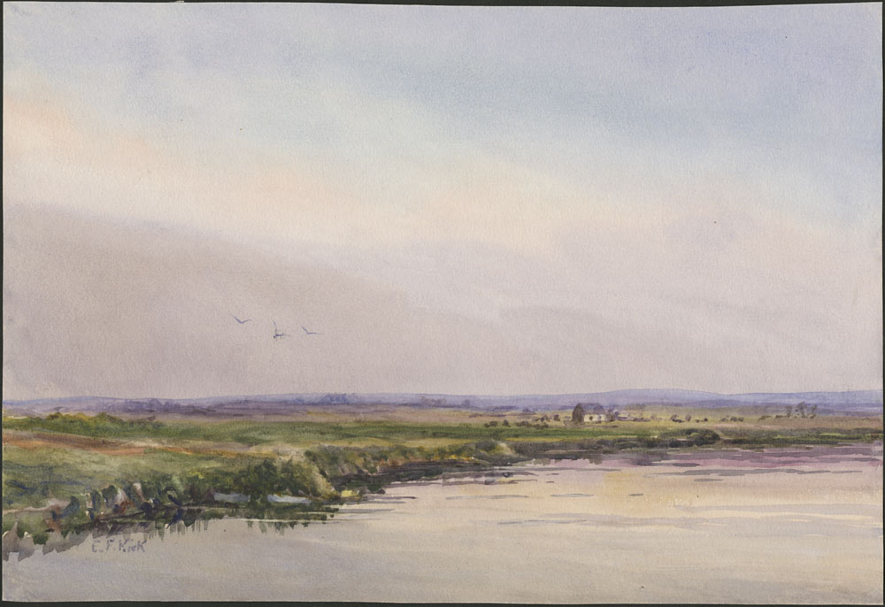 A colour reproduction of a watercolour depicting a landscape dominated by a light smoky sky. There is a river in the foreground with a green shore marking the boundary between sky and water.
