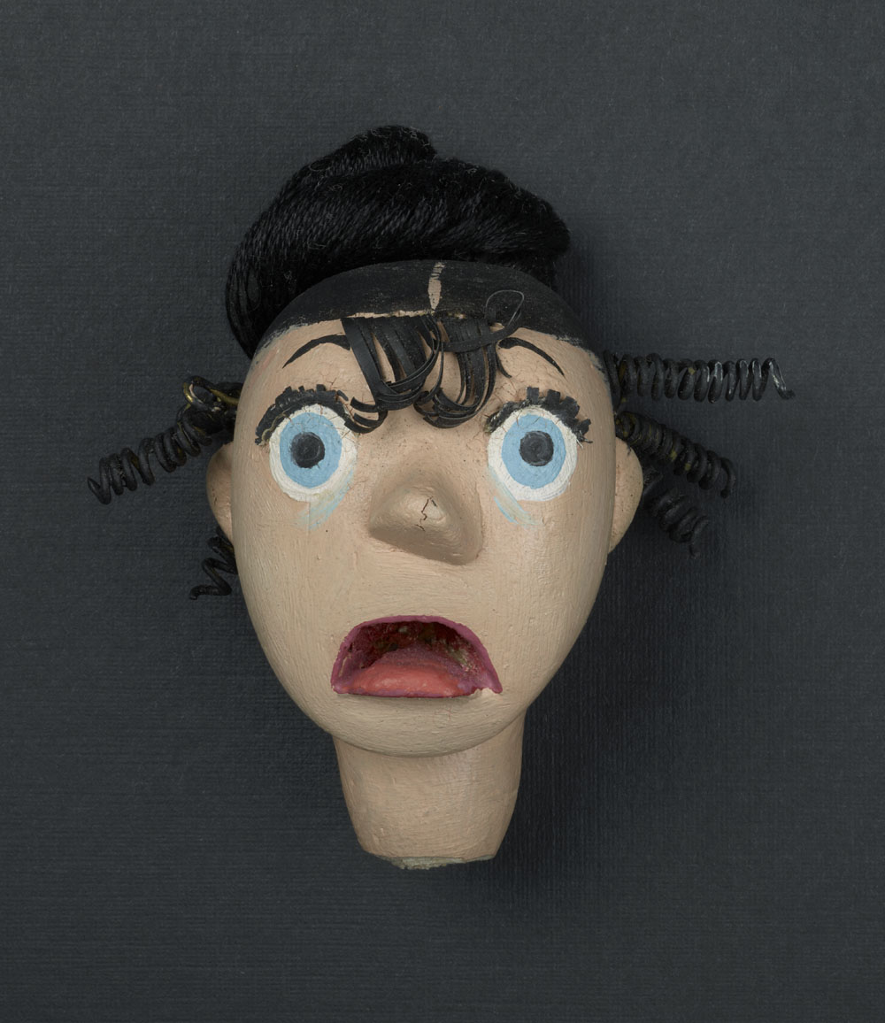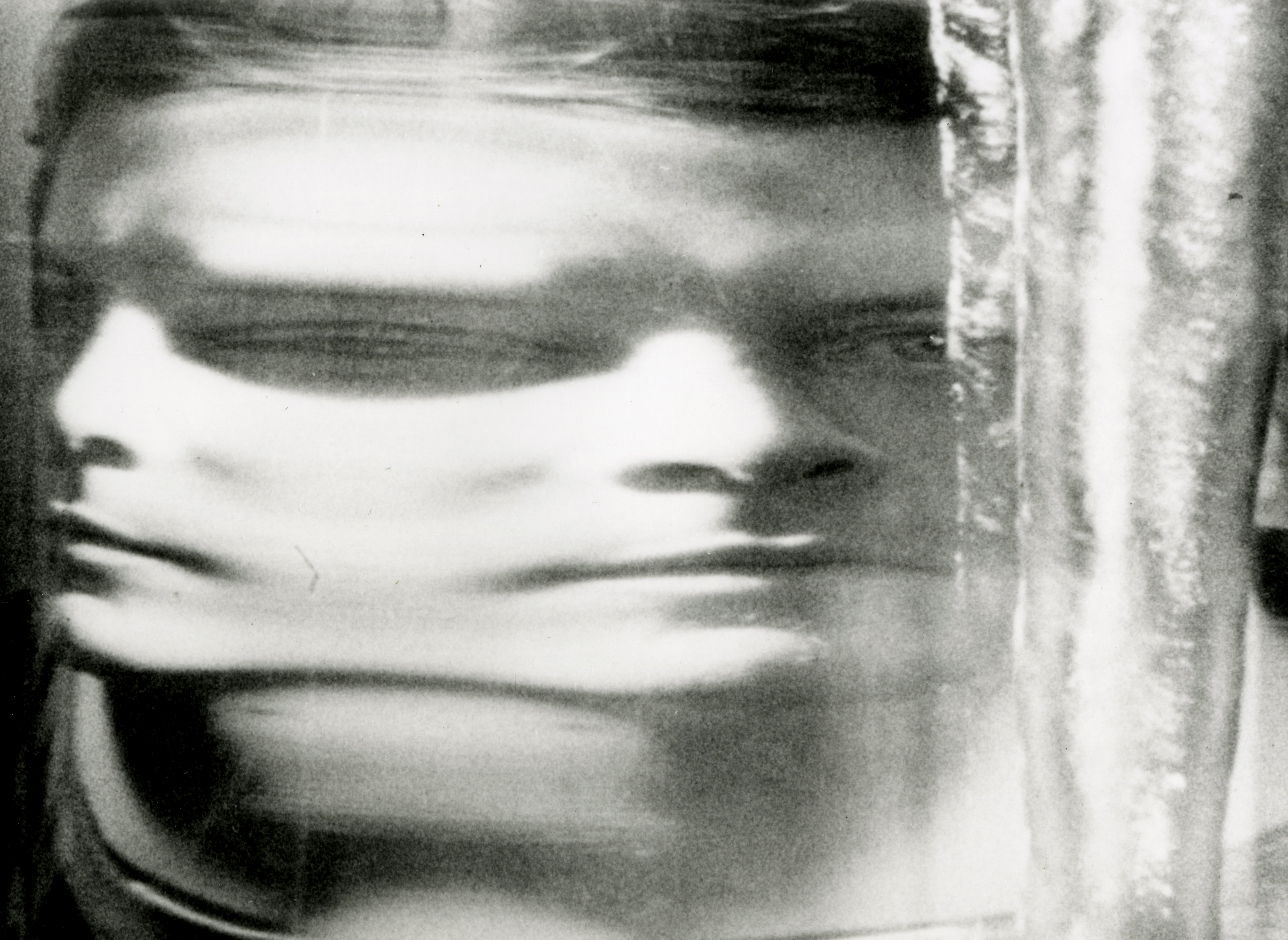 Here, working in a sculptural and painterly way, Hockenhull distorts the image of a character’s face in a carnival mirror. Through his persistent exploration of his theme through a variety of plastic and performance media, the director lands at a single frame that will represent the film in photographs and press releases: a person torn in two, with a third eye gazing into a mediated state.