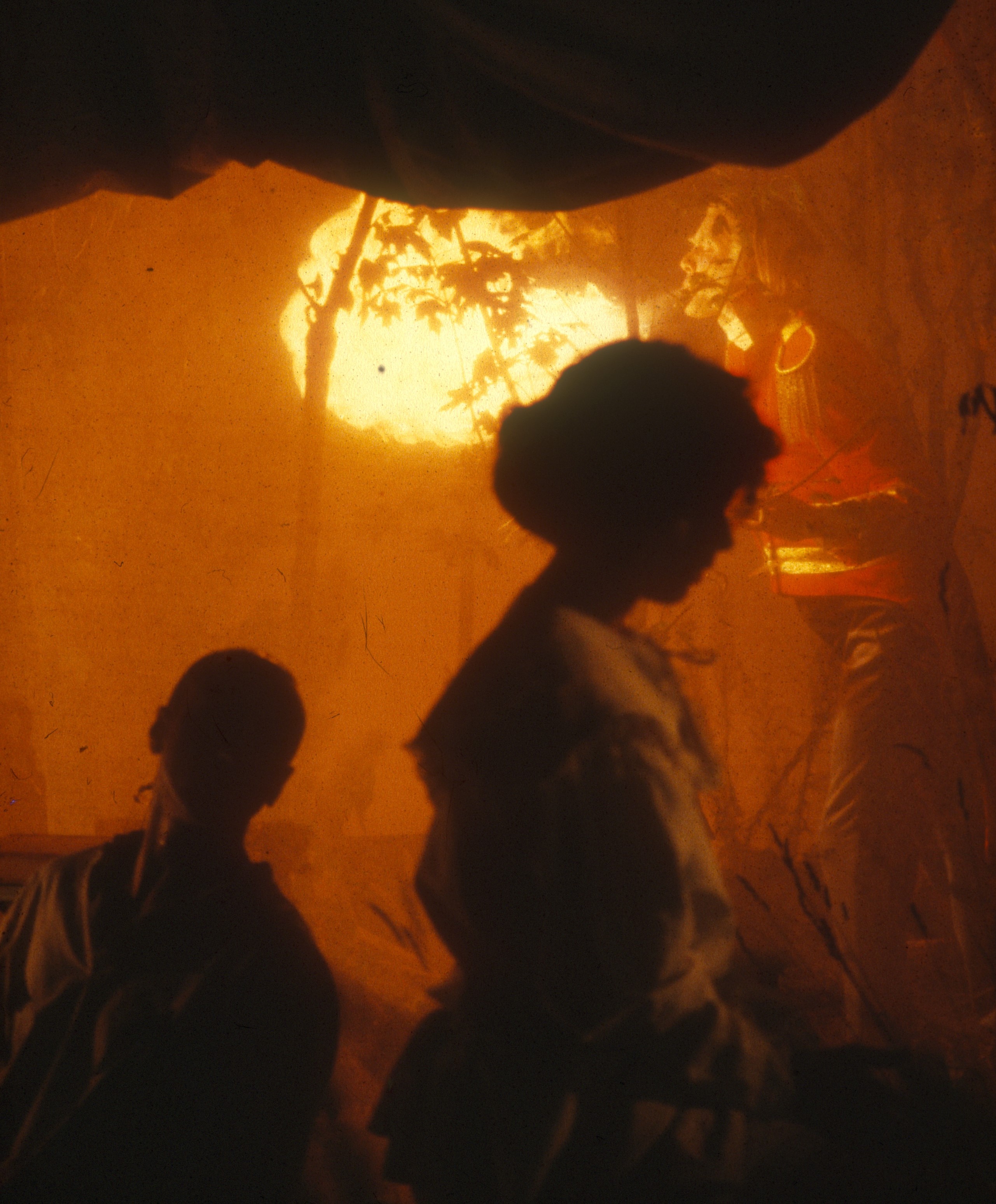 Theatrical mise-en-scène from Exiles, featuring non-diegetic elements such as a circus performer in the background. (MIKAN 6523364)