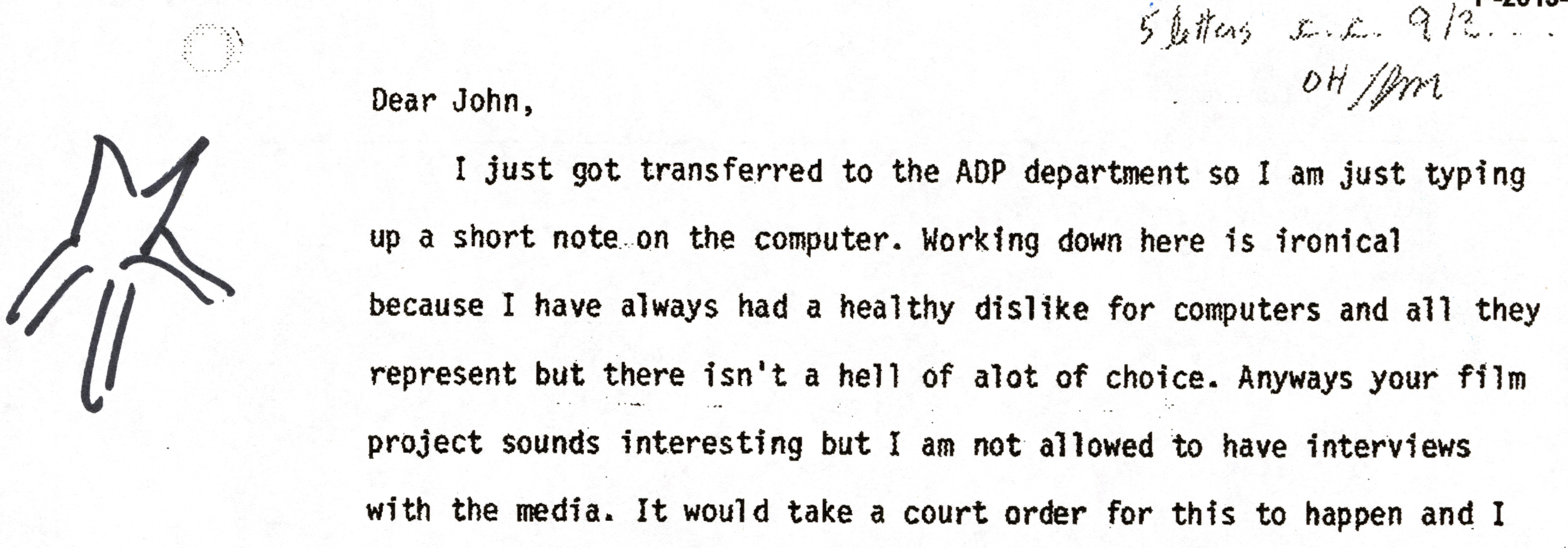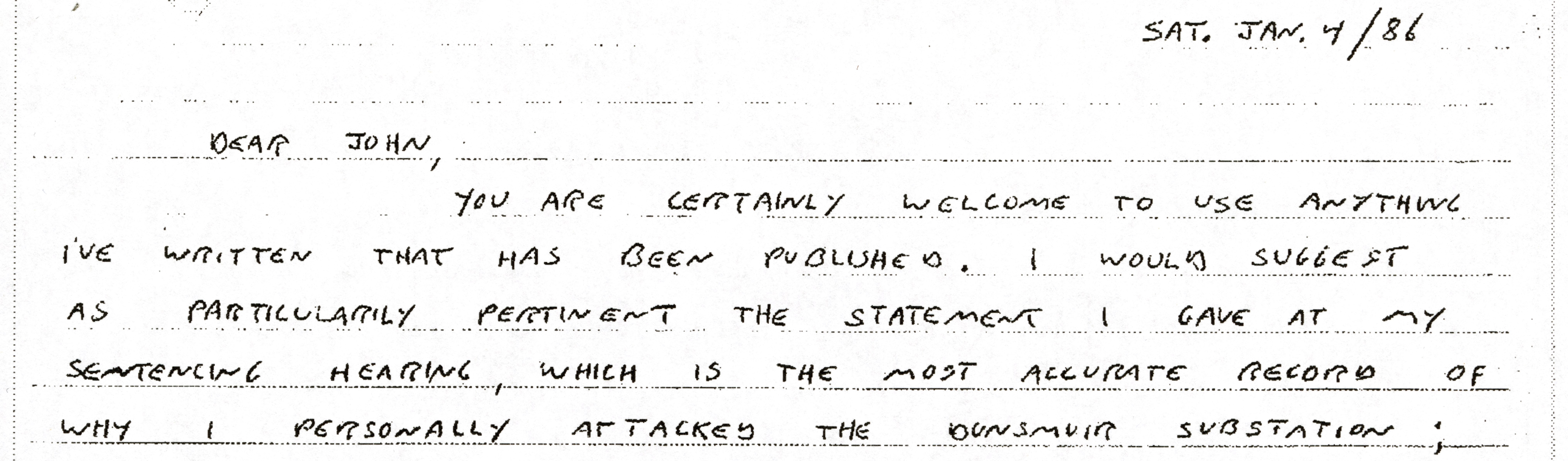 The application also sheds light on the film’s polyvalent collage form. Hockenhull draws from multiple facets of his experience, conscious that the act of making this film will itself be a process of understanding. By this point, he had attended the trials of Direct Action (also known as The Squamish Five) and had written to each of the members. We can see that he isn’t satisfied to watch the news. He feels compelled to be personally present and open to dialogue. The film retains the quality of a frank correspondence.