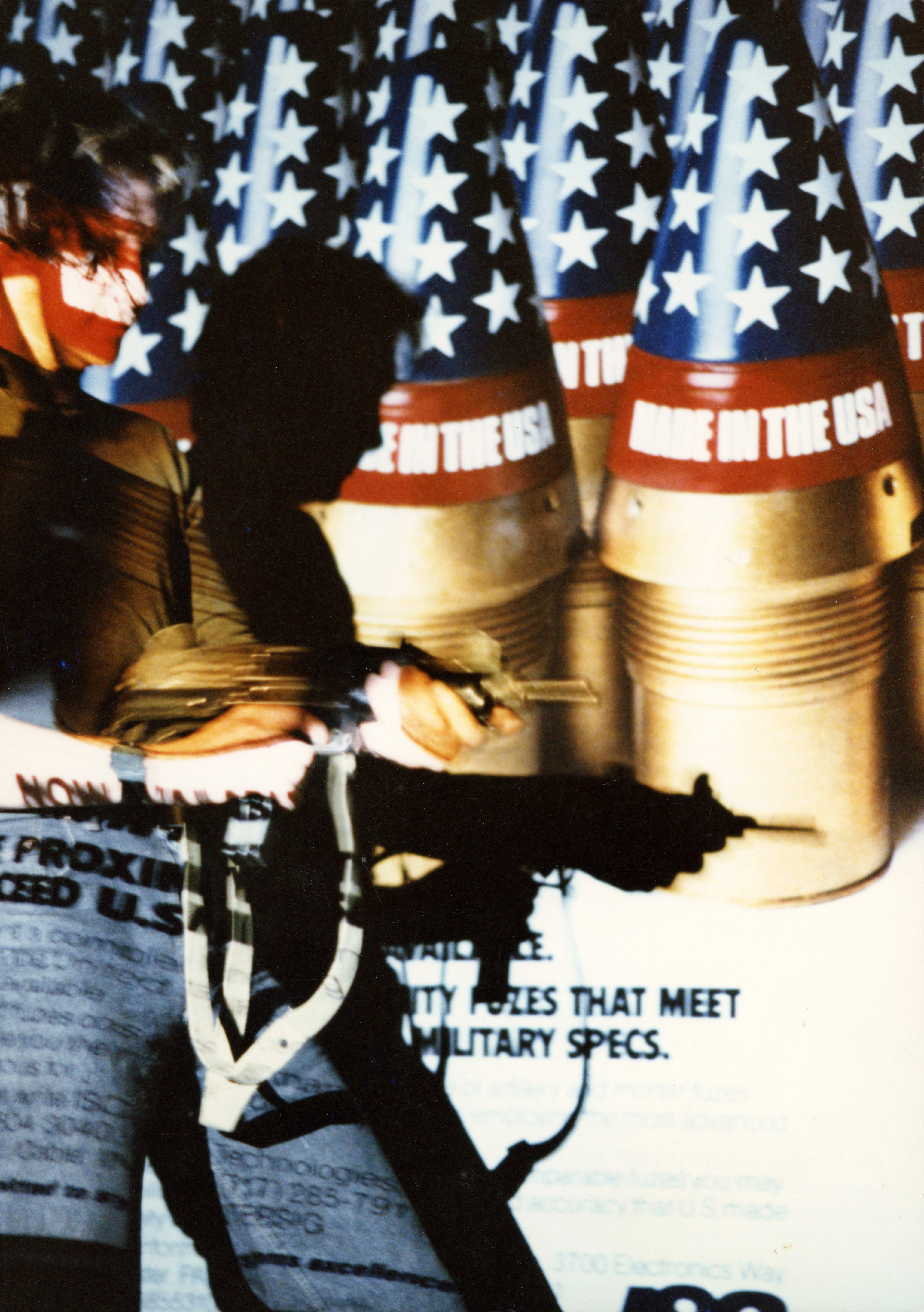 Along with visual artists, we can see that dancers and actors are now part of the studio and are becoming part of the collage. In the image below, an advertisement for weapons has been copied onto a slide and projected into the studio on top of the actor.
