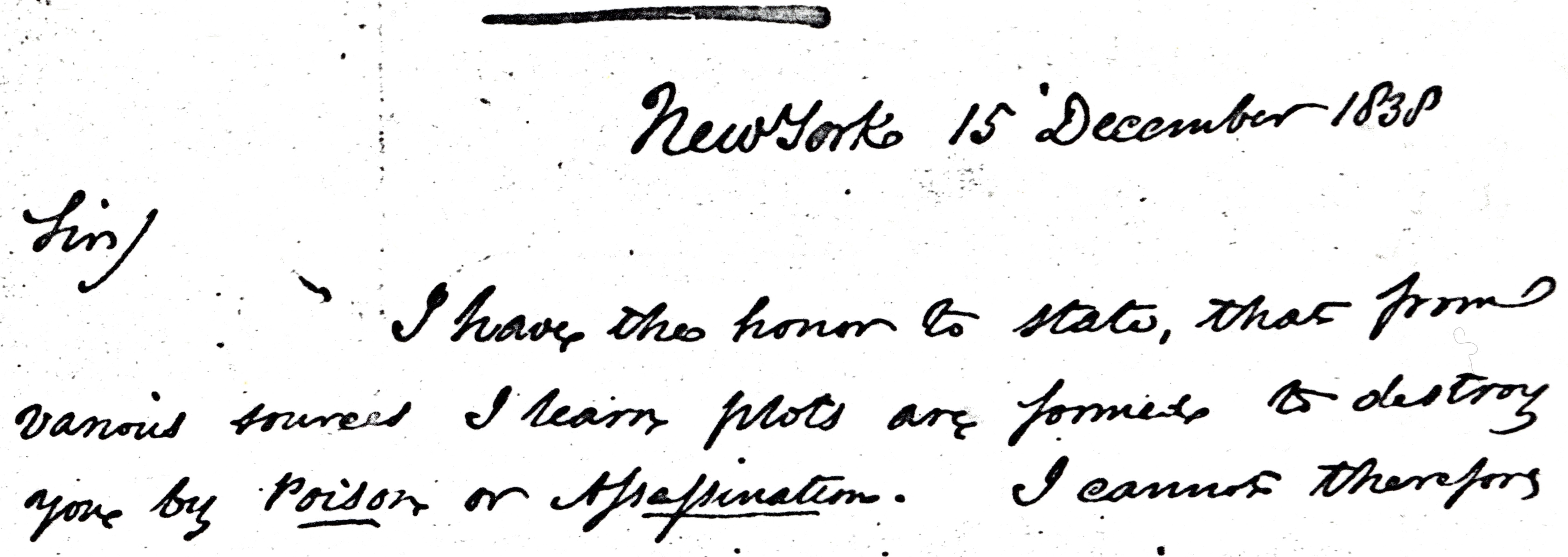 Letter addressed to Lieutenant General Jim John Colborne, written in New York on December 15, 1838. (MIKAN 6523364)