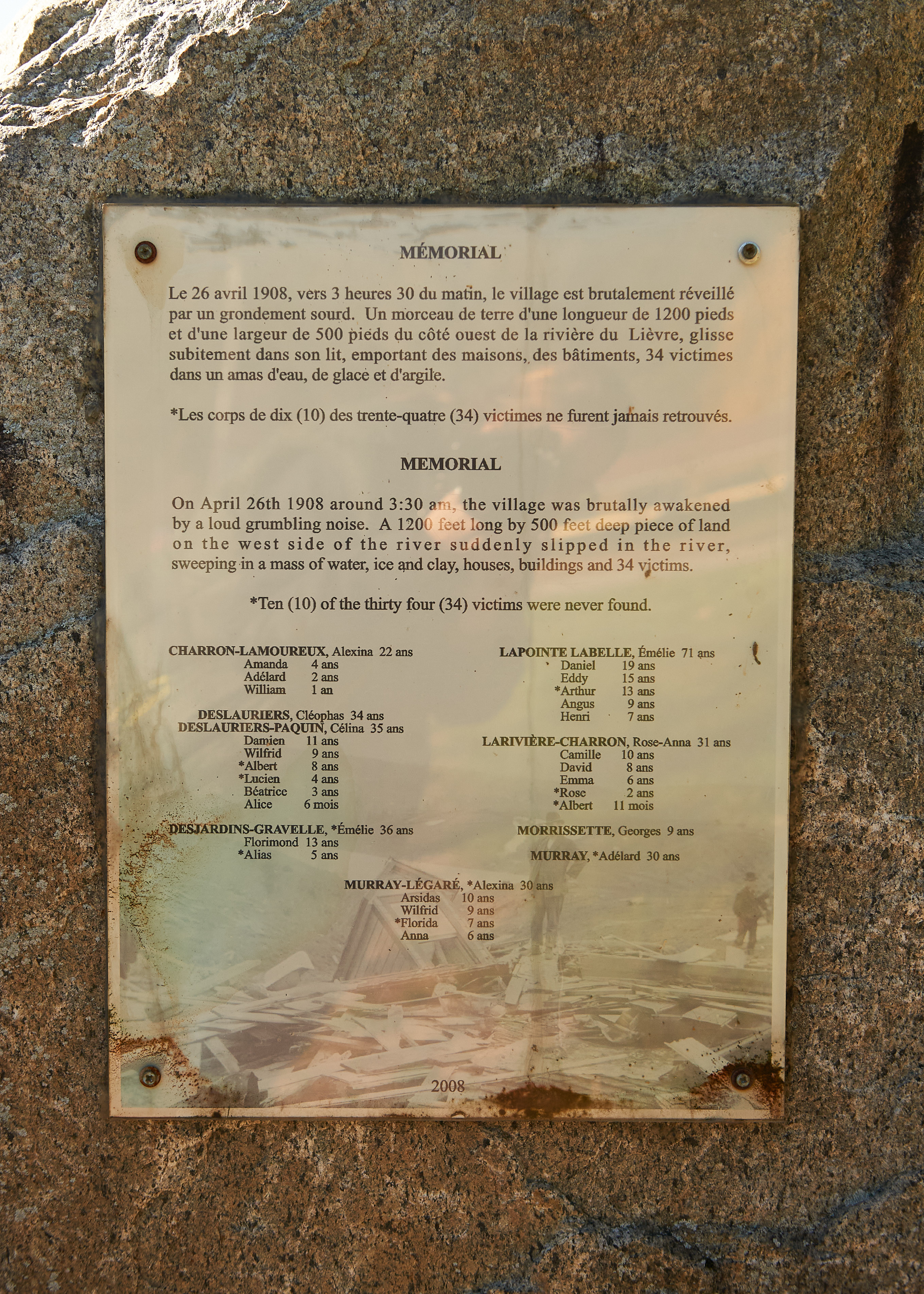 Disaster struck in the middle of the night in Notre-Dame-de-la-Salette on April 26, 1908, when a riverbank of the frozen Lièvre River gave way. Fresh water had infiltrated the Leda clay molecules, making them unstable, and the riverbanks collapsed, propelling a wave of mud, ice and ice-filled water across the river and into the town. Thirty-four people lost their lives and at least twelve homes were destroyed.