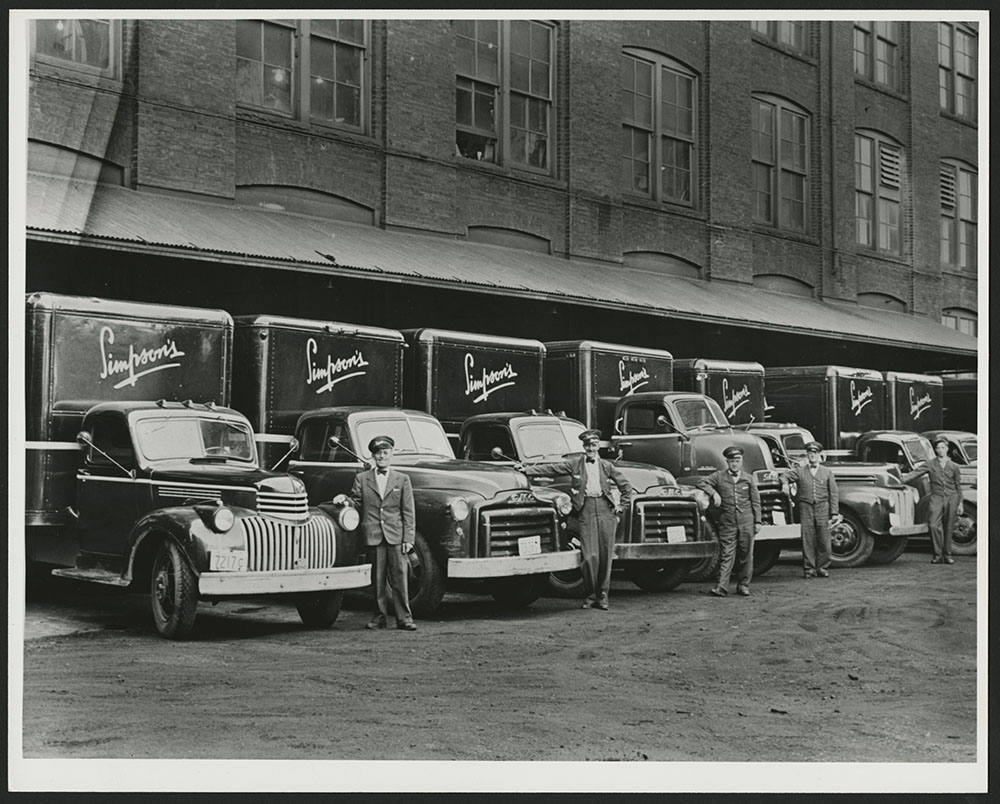 Three black-and-white photographs showing men dressed in uniforms beside Simpson’s delivery trucks, over the decades.