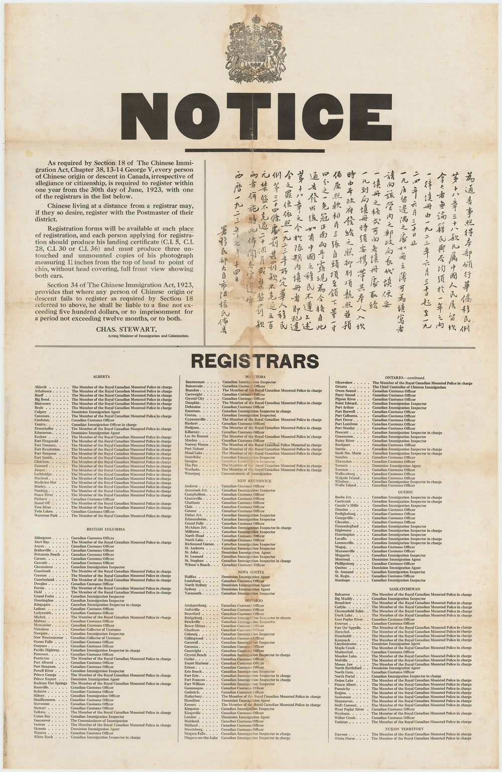 Section 18 was translated into Chinese and posted as a 69 cm by 123 cm (approximately 2 ft. by 4 ft.) public notice with a list of registrars across Canada. Those who failed to comply with registration were “liable to a fine not exceeding five hundred dollars, or to imprisonment for a period not exceeding twelve months, or to both.”