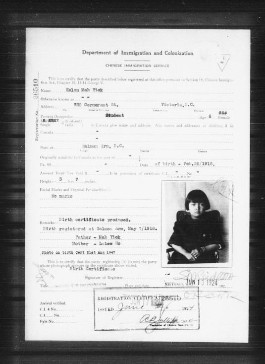 C.I.44 form of Helen Mah Yick, 1924; RG76-D-2, Reel T-16174, Image 00690