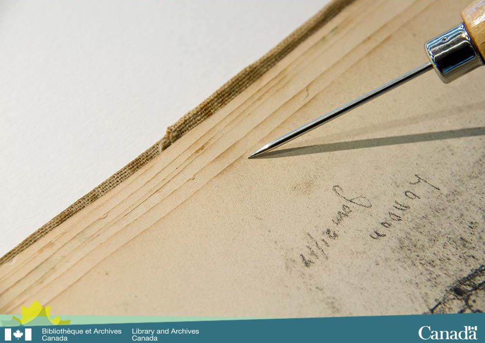 To begin to remedy these issues, the conservation team examined each sketchbook page by page to determine the original orientation and order of pages. This was accomplished by looking at all the little details—the media, watercolour, ink or graphite, the bindings and every instance of damage to the pages—and mapping them out very carefully. The team used various light sources, angling the light to view physical details of the paper, a microscope for magnifying every minute detail and the precise measurement of each page.