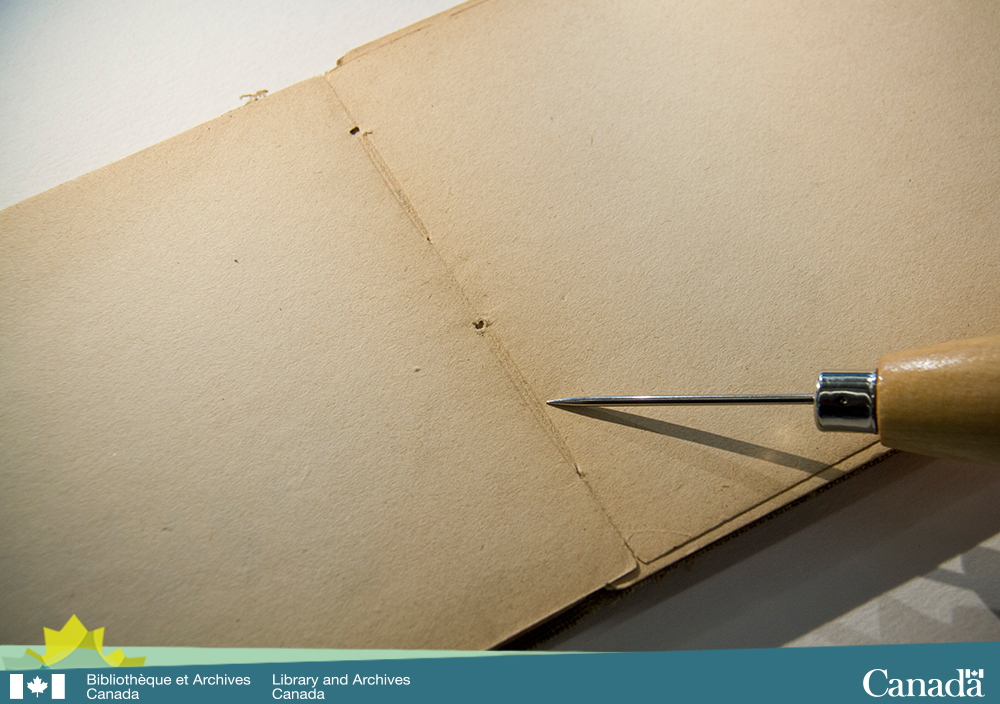 Colour photograph showing an open sketchbook lying flat on a table. An awl points to the sewing thread marks on the paper.