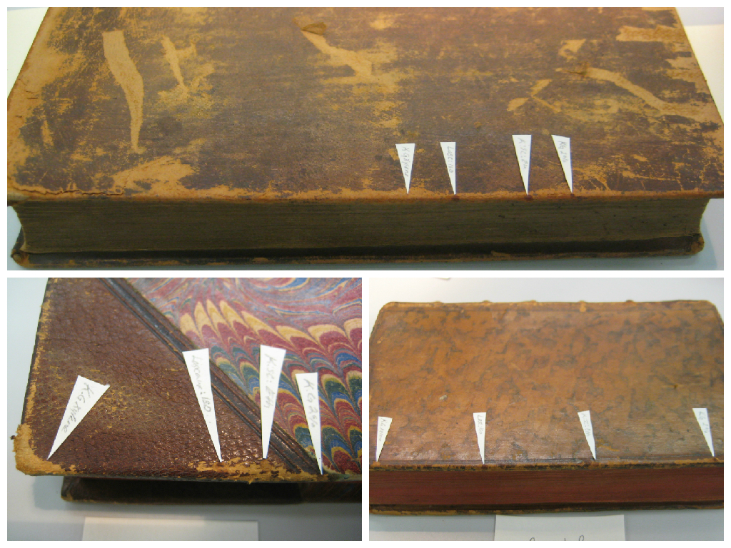 A collage of three colour photographs each showing a book with little white flags on it. The flags are located in the areas that were spot tested with the consolidants.