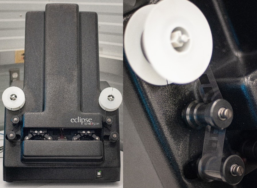 For this project, the digitization of the 1931 Census was performed with the use of the Eclipse Rollfilm scanner by nextScan, a dedicated microfilm scanner designed to digitize both 16-mm and 35-mm reels, in conjunction with an off-network computer. Film is threaded from the supply reel past stationary rollers and film guides to a take-up reel. The pinch rollers lower to hold the film in place on the film guides, automatically adjusting the tension of the film. The film is guided past a macro lens and digital sensor above, while lit from below through the film emulsion by a strip of red light. The reel is digitized as one long, uncompressed, grey-scale image file, referred to as a ribbon.