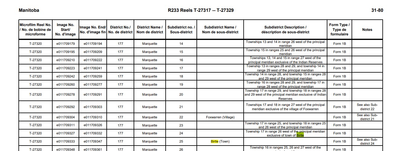 You may choose to begin with a keyword search related to your place of interest in the finding aid for a province or territory. For example, searching the Manitoba sub-district description finding aid for “Birtle” yields three results within the census district “Marquette”: sub-district 25 for “Birtle (Town)”; sub-district 24 for “Township 17 in range 26 west of the principal meridian exclusive of town of Birtle”; and sub-district 63 for the residential school of the same name. Alternatively, you may choose to navigate to a particular census district (like “Marquette”), then browse all sub-district descriptions within that census district.