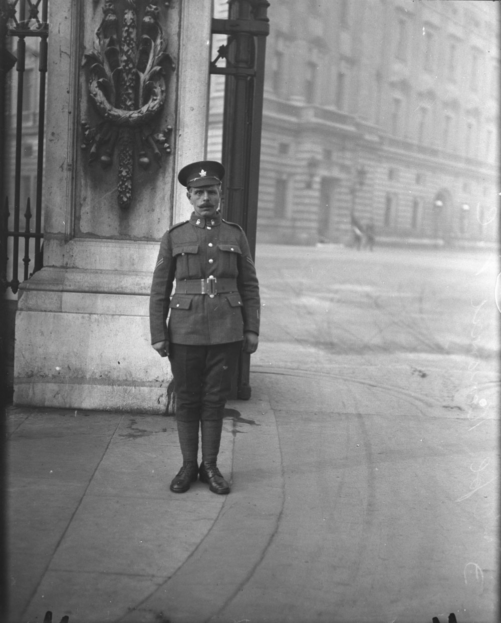 Major George Randolph Pearkes, VC, wearing the Military Cross service ribbon (he had not yet received the ribbon for the Victoria Cross). Note the four wound stripes on his sleeve. Photograph taken in December 1917 by William Rider-Rider (MIKAN 3219828)