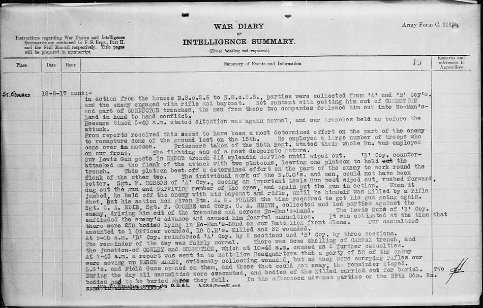 It was entirely due to his determination and fearless personality that he was able to maintain his objective with the small number of men at his command against repeated enemy counter-attacks, both his flanks being unprotected for a considerable depth meanwhile.