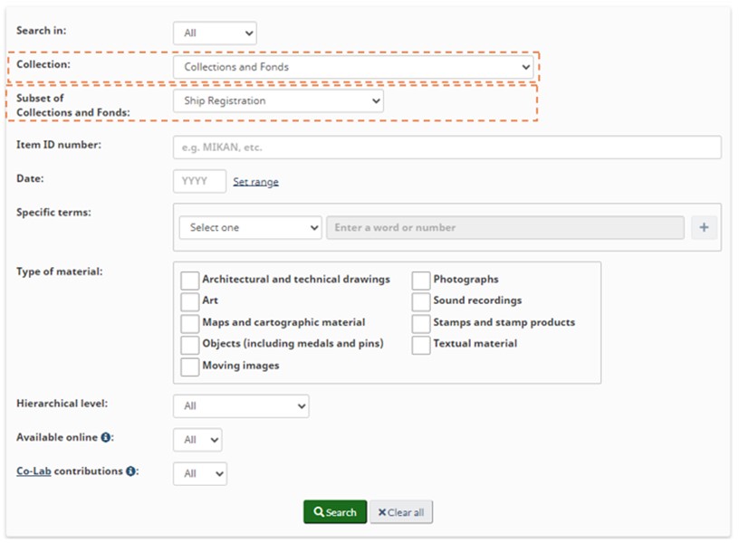 3. Select “Ship Registration” under Subset of Collections and Fonds