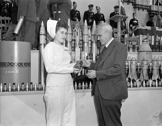 Edna Poirier, an employee of Defence Industries Limited, presents the Honourable C.D. Howe with the hundred-millionth projectile manufactured in the Cherrier plant, Saint-Paul-l’Hermite, Quebec, September 1944 (e000762462)