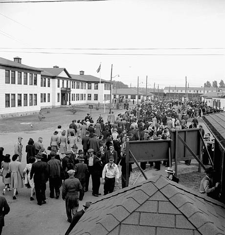 Workers leaving the Cherrier plant of Defence Industries Limited to take the train, Saint-Paul-l’Hermite, Quebec, June 1944 (e000762822)