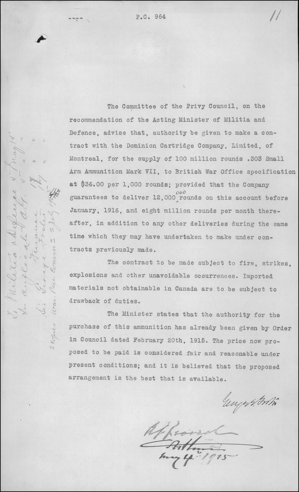 Privy Council Office Order-in-Council approving a contract with the Dominion Cartridge Company for the production of munitions, May 1915 (e010916133)