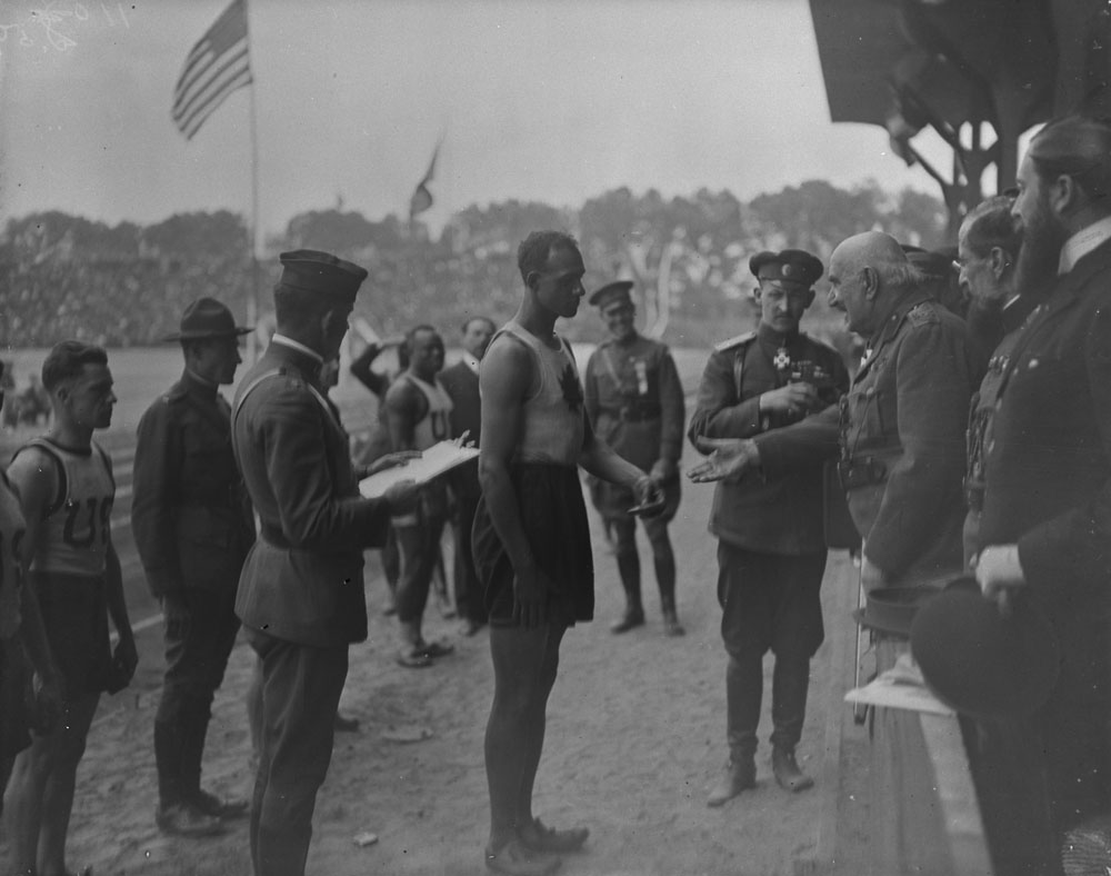 John Armstrong Howard receiving his bronze medal for the 100-metre event from the King of Montenegro, at the Inter-Allied Games in Pershing Stadium, Paris, July 1919 (a006626)