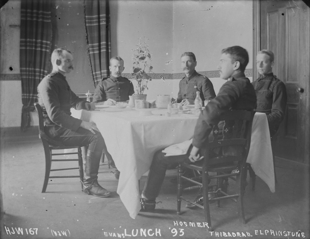 Lunch ’93. Left to right: H.J. Woodside, Captain T.D.B. Evans, Hosmer, Thibodeau, Elphinstone, 1893. Accession 1967-025, item 167. Credit: Henry Joseph Woodside/Library and Archives Canada/PA-016013