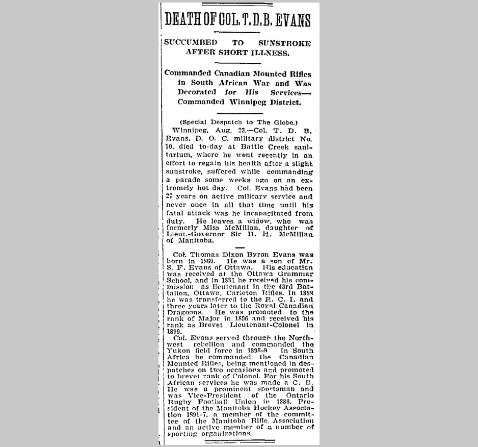 DEATH OF COL. T.D.B. EVANS: SUCCUMBED TO SUNSTROKE AFTER SHORT ILLNESS, Commanded Canadian Mounted Rifles in South African War and Was Decorated for His Services—Commanded Winnipeg District, The Globe (1844–1936), Toronto, Ontario, August 24, 1908: 1 (OCLC 1775438)