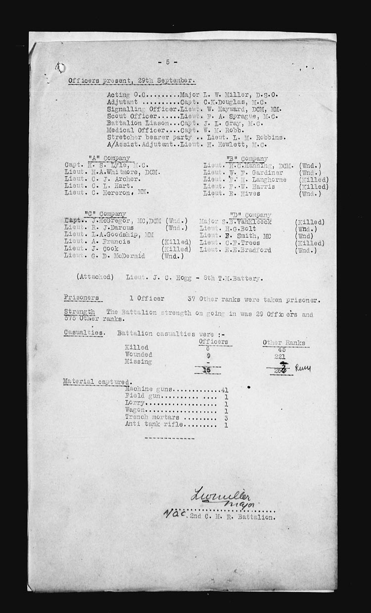 As the advance inched along, the Company was held up by very heavy machine gun fire. Under a spray of bullets, Cairns and other soldiers moved to outflank the gun. Crawling on their hands and knees, under cover from friendly rapid machine gun fire, the party succeeded in closing in on the battery. They seized 3 field guns, a trench mortar, 7 machine guns, and over 50 prisoners. Cairns went on to lead his men to capture the railway and establish a post.