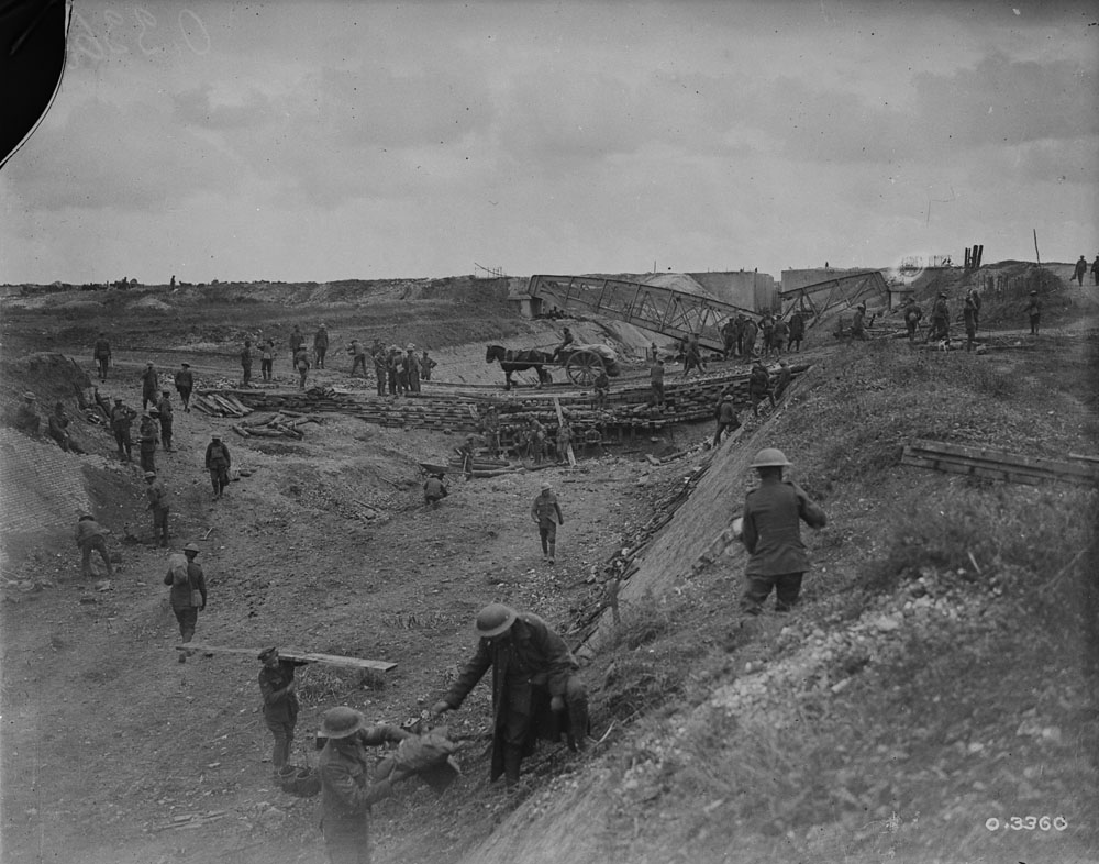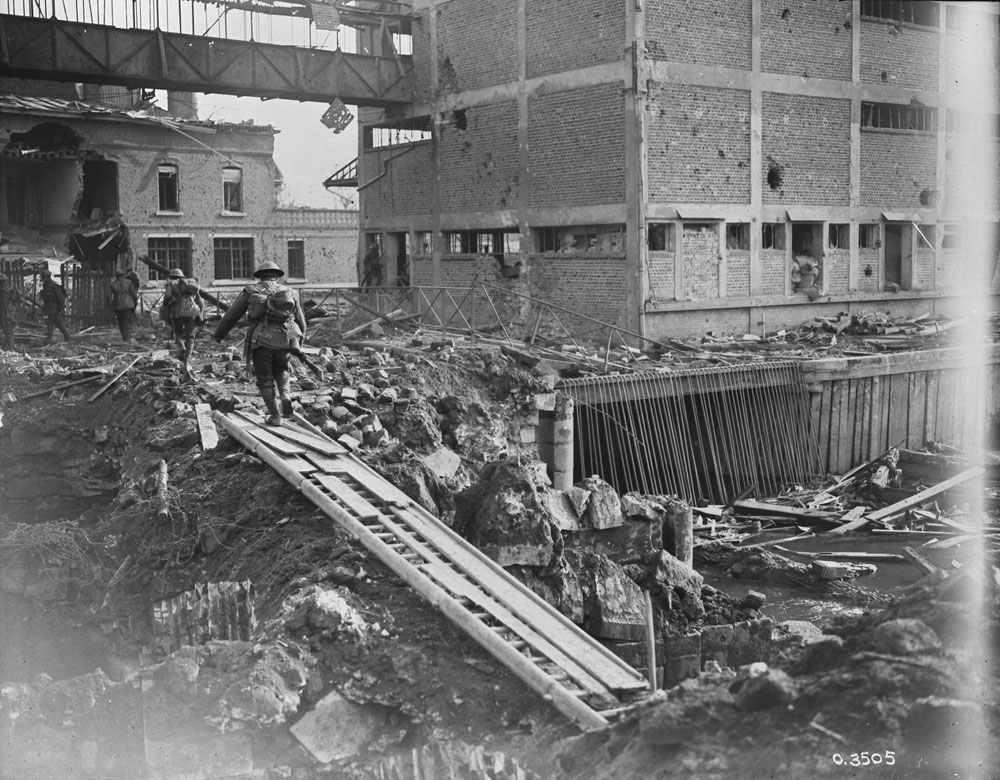 Canadians entering Valenciennes over an improvised bridge, November, 1918 (a003376)