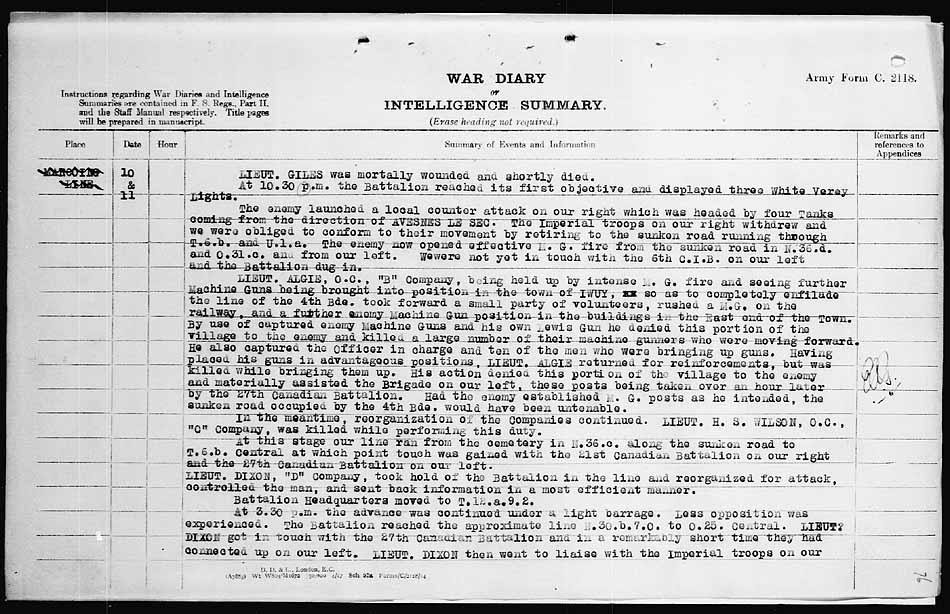 Cairns’ heroic maneuvers and self-sacrifice are detailed in the 46th Battalion’s war diaries for November 1918 (pp. 21, 22, 23), where he is mentioned by name throughout the whole account. He is one of several names given special recognition for his actions in Valenciennes. His efforts and bravery helped his company achieve their objectives. By the end of the day, the Canadian Corps captured approximately 1,800 German soldiers and killed more than 800 men. The Canadian losses including Cairns were 80 killed, and approximately 300 wounded.