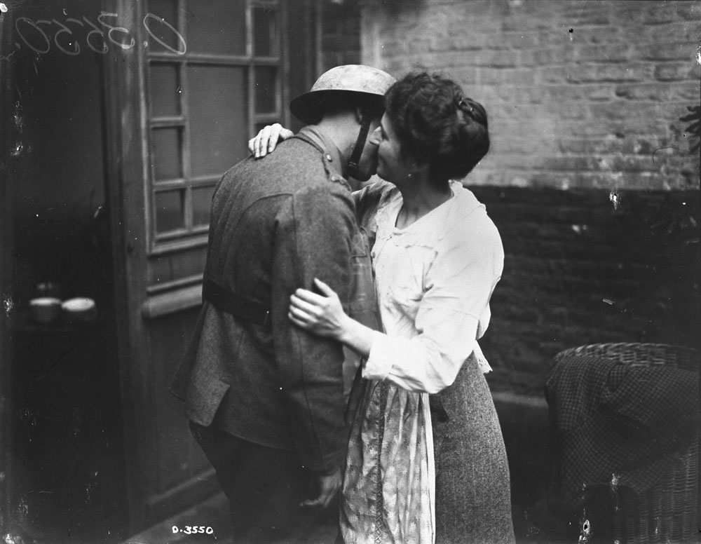 French civilian woman kissing a Canadian soldier after the Canadians cleared the Germans out of Valenciennes, November 1918 (a003451)
